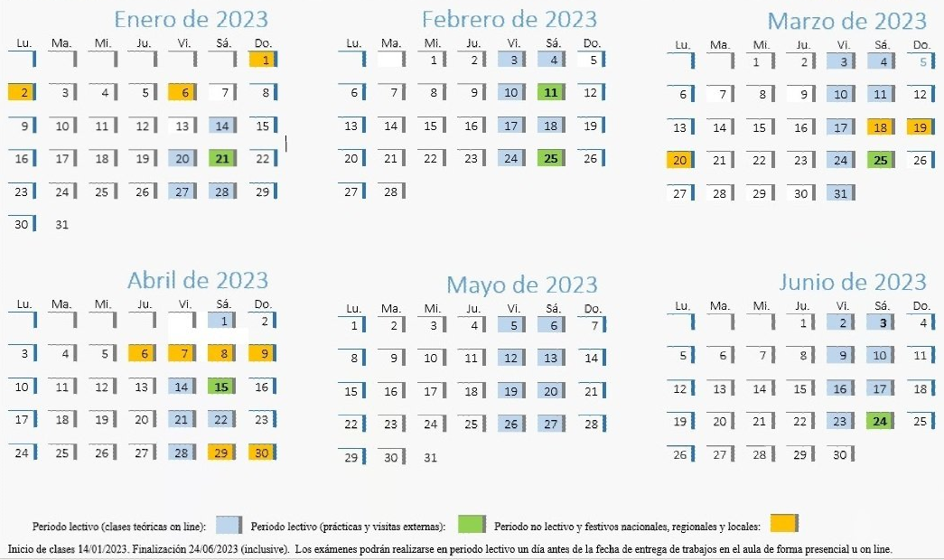 Academic calendar with online sessions and face-to-face practices with organized visits